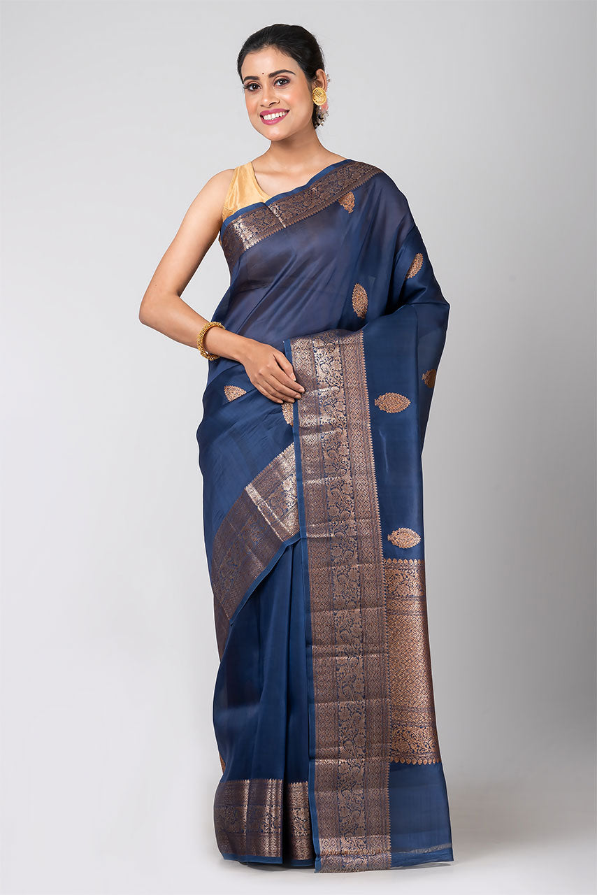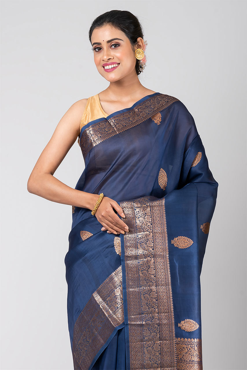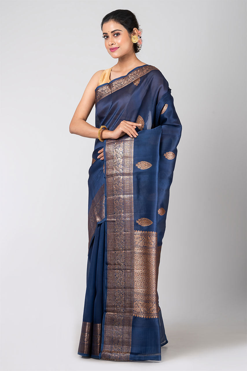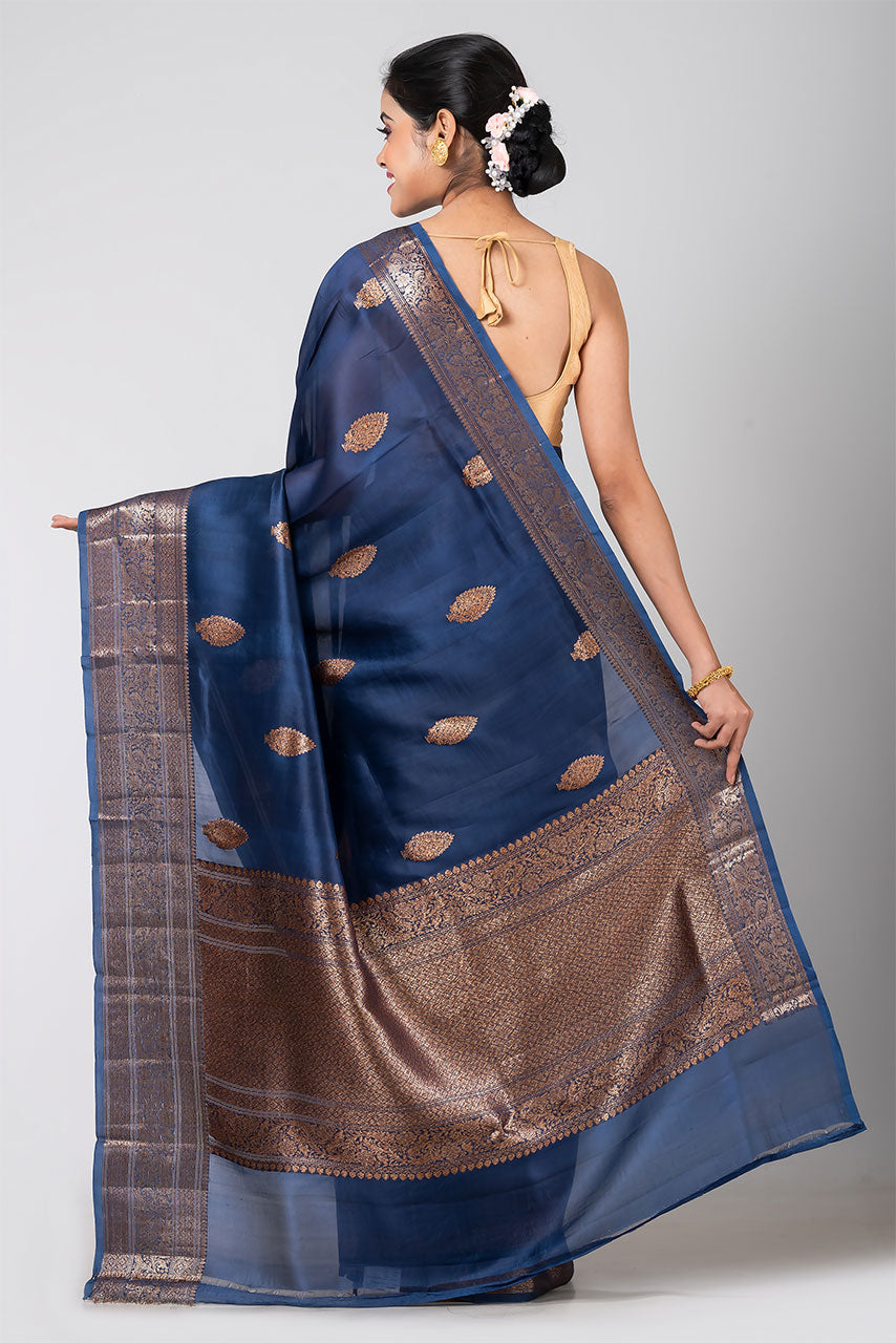 Description - Step into a world of ethereal beauty with our Organza Saree collection. This unique piece is a masterpiece, blending traditional charm with contemporary allure. Our blue Organza Saree, adorned with antique zari bootas and border, epitomises elegance. Paired with a wine-colored blouse, it's a timeless ensemble that commands attention.