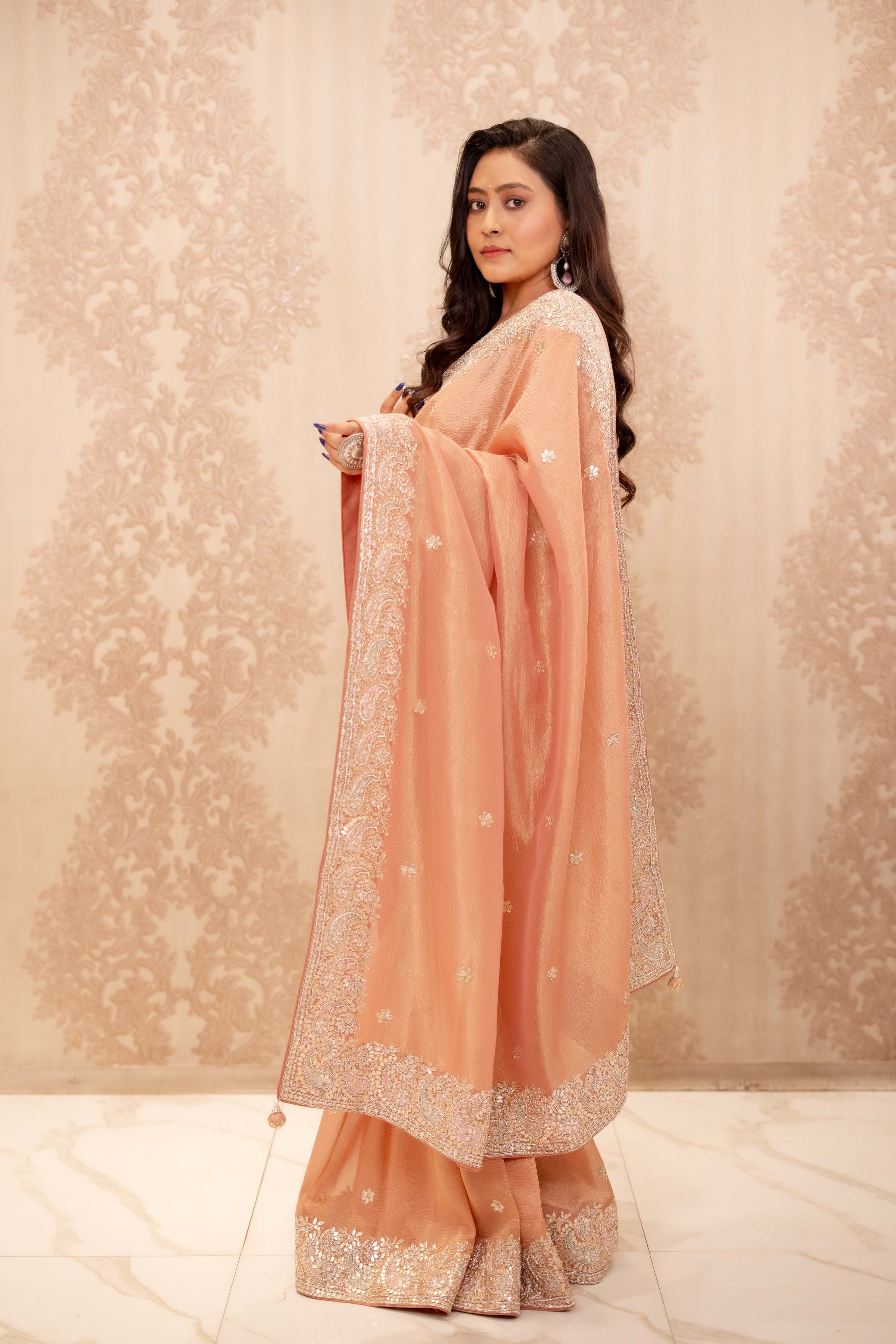 Description - This stunning orange crushed tissue saree showcases exquisite hand embroidery, creating a unique texture and depth. The vibrant hue combined with the delicate craftsmanship makes this a truly one-of-a-kind piece, ideal for those who appreciate traditional beauty with a contemporary twist.