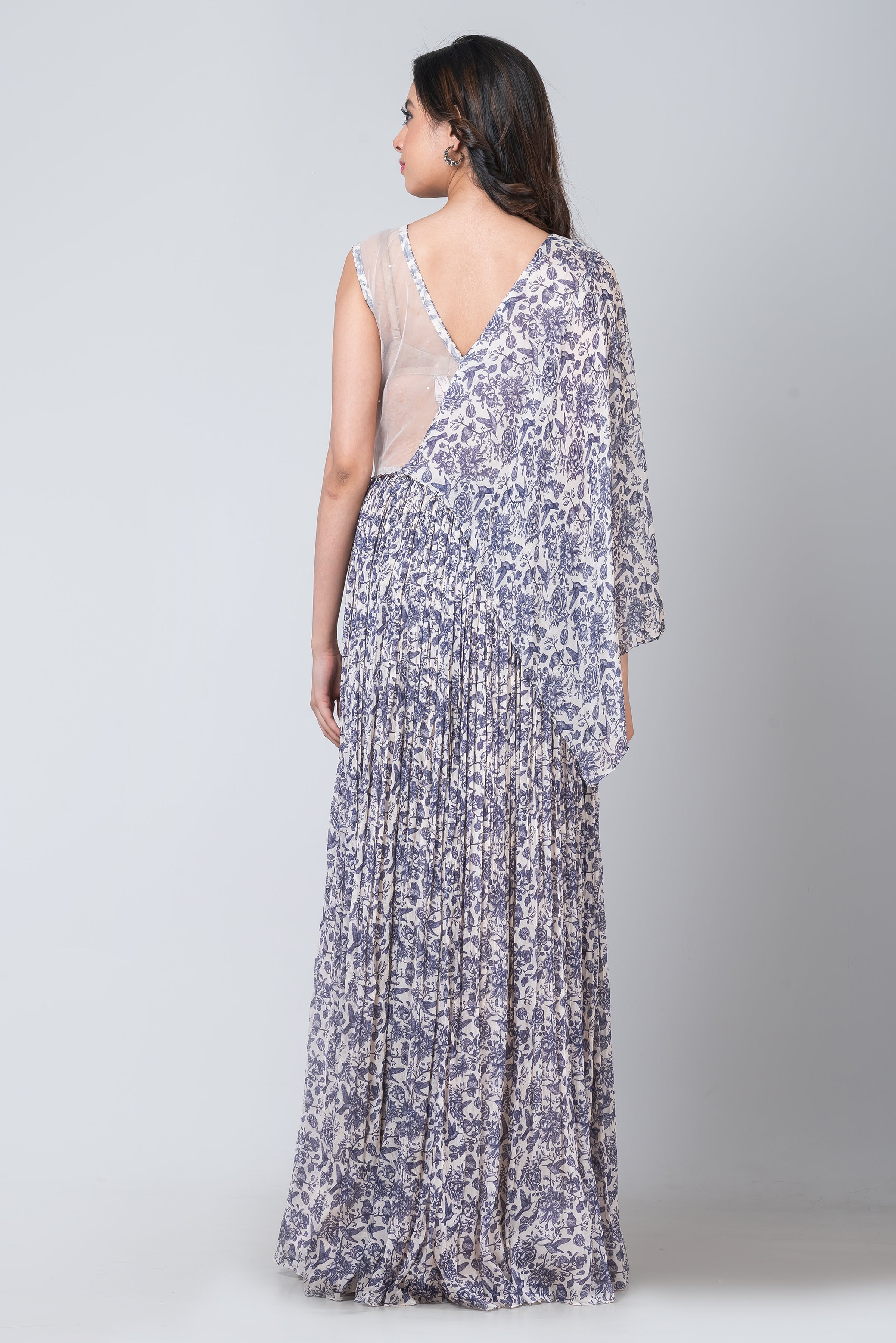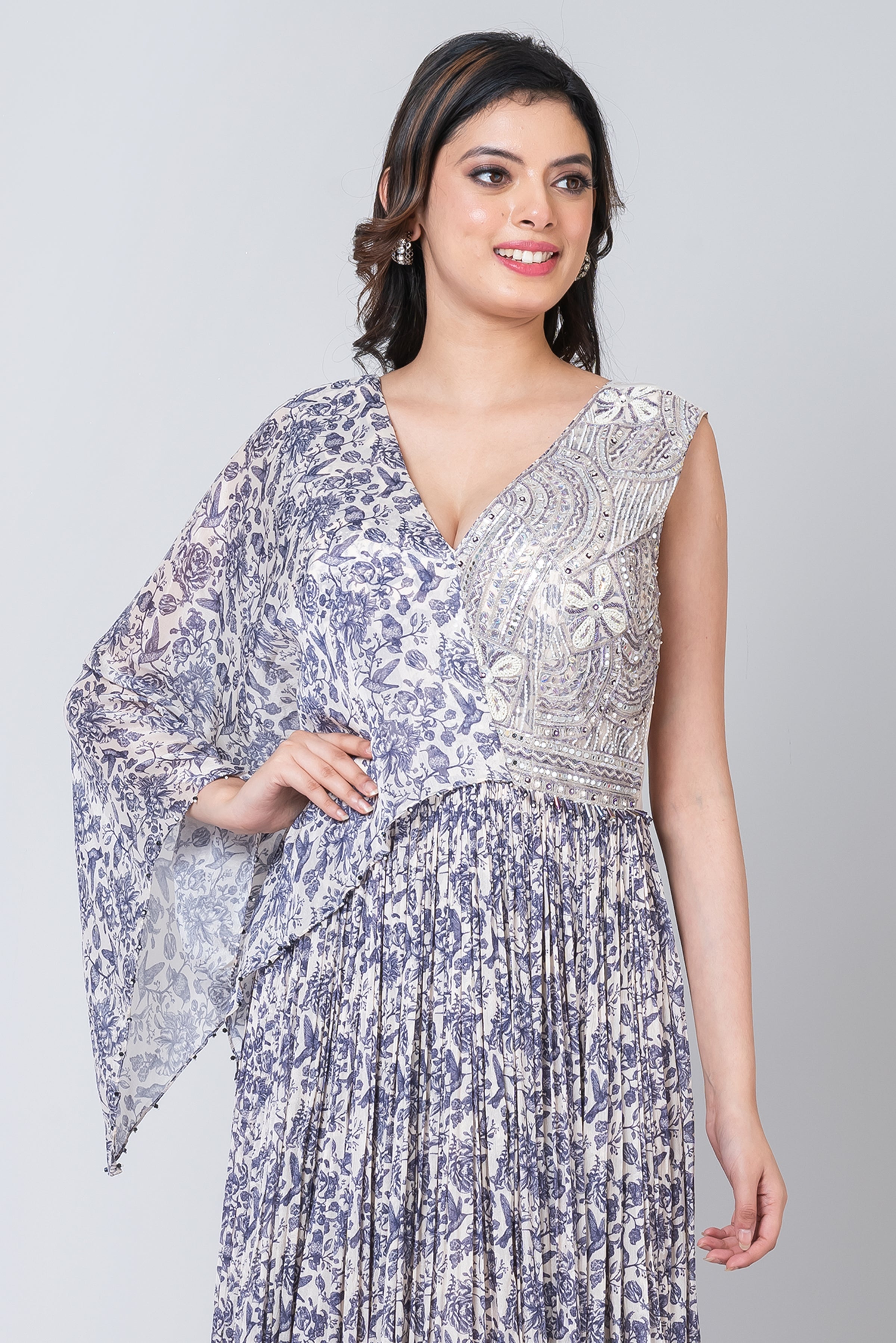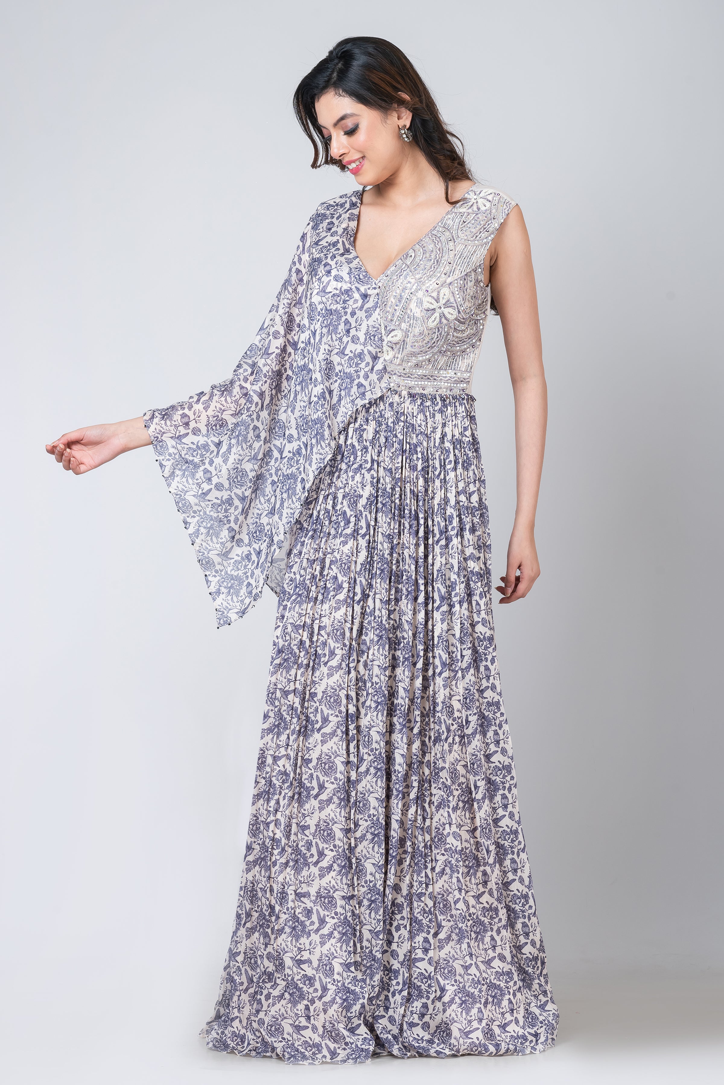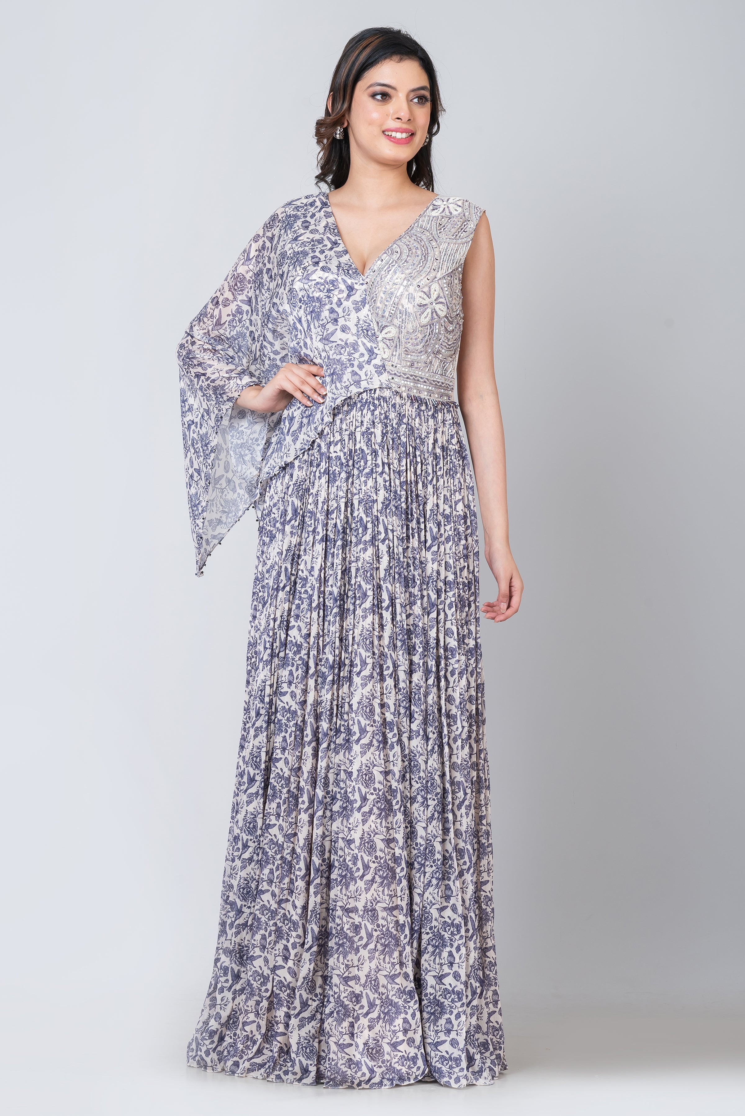 Description- Step into the realm of timeless elegance with this enchanting Chinon gown. With its graceful silhouette and exquisite detailing of mirror, resham, and sequence work adorning the one-side falling sleeves, it embodies sheer sophistication. Perfect for high-profile events like galas or red-carpet affairs, pair it with a chic clutch, stunning statement earrings, and captivating heels to create a mesmerising ensemble that radiates glamour and refinement.
